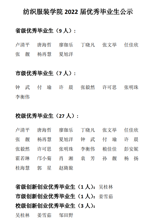 根据公司《关于评选2022届省、市、校级优秀毕业生和创新创业优秀毕业生的通知》的要求和公司优秀毕业生评定办法,经本人申请、班级推荐、班主任审核、公司民主评议,初步评定了BWIN必赢2022届优秀毕业生,现将推荐名单公示如下: