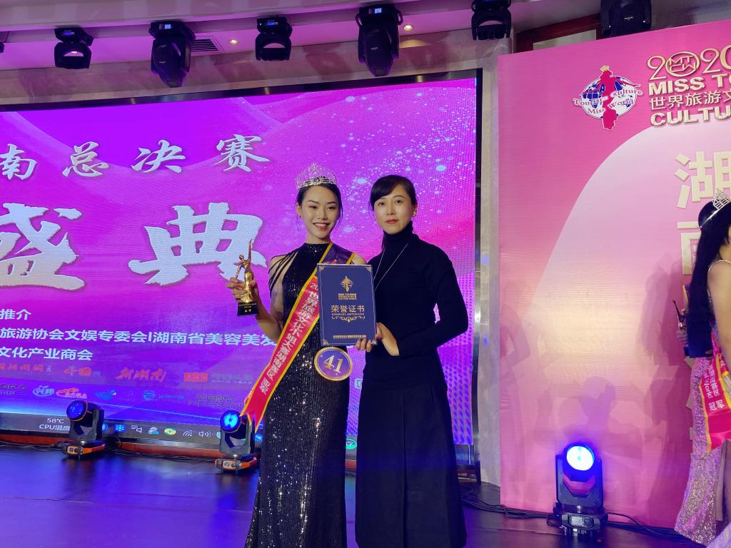 本届世界旅游文化小姐大赛湖南总决赛改变单一选美制模式,通过开场古装秀,潇湘智慧秀,潇湘才艺秀,潇湘风韵旗袍秀,盛世礼赞晚礼秀等几大环节展开精彩而激烈的角逐。公司41号朱佳怡同学凭借出众的气质以及聪明的才智在舞台上演绎了别具韵味的中国女性自信、优雅之美,受到评委和现场观众的一致认可,荣获亚军荣誉。
