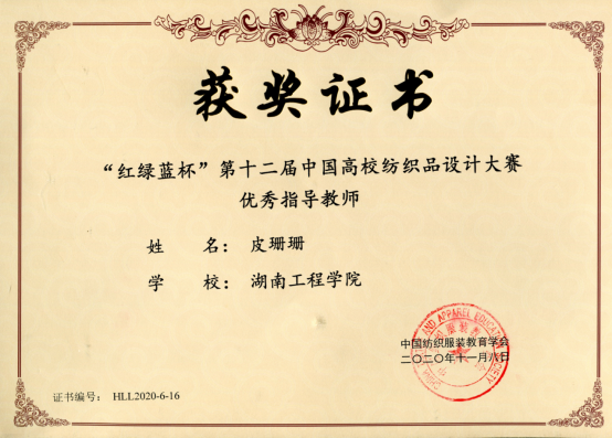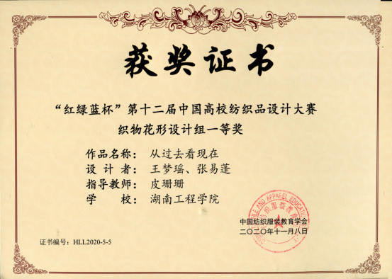 2020年11月7日,由中国纺织服装教育学会主办的“红绿蓝杯”第十二届中国高校纺织品设计大赛作品评审会在绍兴文理公司河西校区举行。BWIN必赢学子喜获佳绩,一等奖两项,二等奖四项,三等奖九项。其中,王梦瑶、张易蓬同学的作品《从过去看现在》(指导老师:皮珊珊)和黄仕卿、熊紫吟、李娜同学的作品《微*不微》(指导老师:周琪)荣获一等奖。