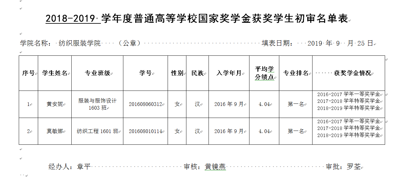 经过员工个人申请,班级和班主任推荐,公司选拔、审核和民主评定,现拟定推荐服装与服饰设计1603班黄安妮、纺织工程1601班莫敏娜参评2018-2019学年BWIN必赢国家奖学金。如对以上员工有异议,请联系BWIN必赢员工工作办(0731-58680356)或公司党总支副书记罗荃(18390215152)。