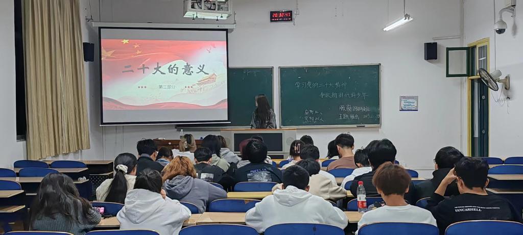 主题班会上,各班按照班会要求通过PPT和播放视频等形式,组织同学们学习了党的二十大报告、新修订的《中国共产党章程》等文件,加强了同学们对二十大报告中的新表述、新论断的理解,教育引导员工在奋进新征程路上全面贯彻习近平新时代中国特色社会主义思想,勇做走在时代前列的奋进者、开拓者、奉献者。班会上同学们积极互动,踊跃发言,纷纷表示,作为新时代的青年,要坚定不移跟党走,勇担时代重任,努力学习、砥砺奋进,以实际行动为党和国家贡献青春力量。