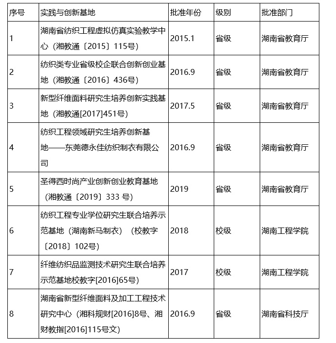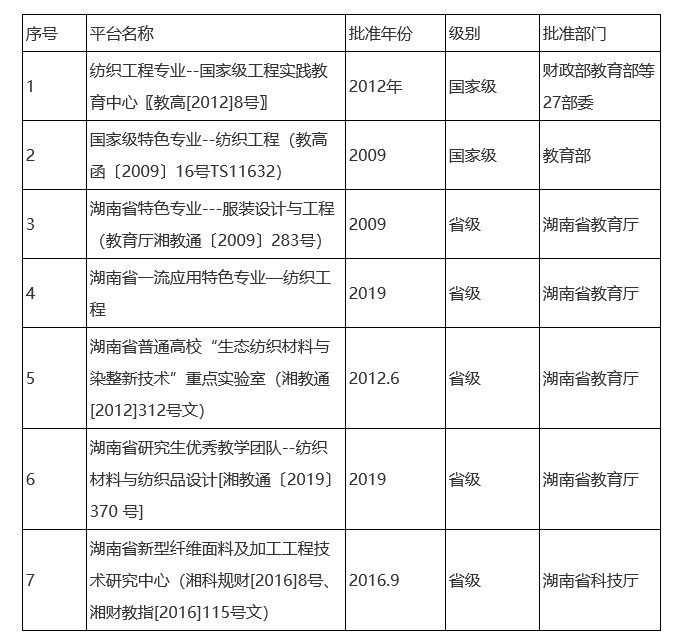 至十三五末,纺织工程学科已先后建立了2个国家级教学平台,9个省级教学平台,2个省级研究生联合培养示范基地,2个省级科研平台,2个校级公司产品示范基地。十三五期间,本学科新增湖南省工程技术研究中心1个,湖南省研究生优秀教学团队1个,湖南省一流专业1个。