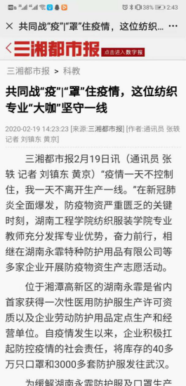 近年来,公司大力弘扬“一丝不苟、精益求精、勇于创新、追求卓越”的工匠精神,营造“做专、做精、做细、做实”的干事氛围,充分发挥优秀技能人才在各领域创造和实现个人及集体价值。在疫情期间,涌现了“疫情一天不控制住,我一天不离开生产一线”的纺织大咖:杨梅老师和汪泽幸老师;服装与服饰设计教研室获湘潭市三八红旗岗等多项个人及集体典型。