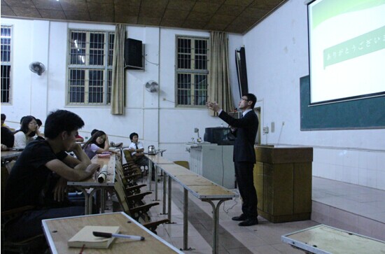 宣讲会伊始,罗老师向同学们详细介绍了远道而来的两位友人,并表示热烈欢迎。接着,渡边先生通过了解在场同学学习日语的意向后,热情地向大家介绍了横浜国际语公司,并建议想去日本留学的同学可以先去语言公司学习日语。