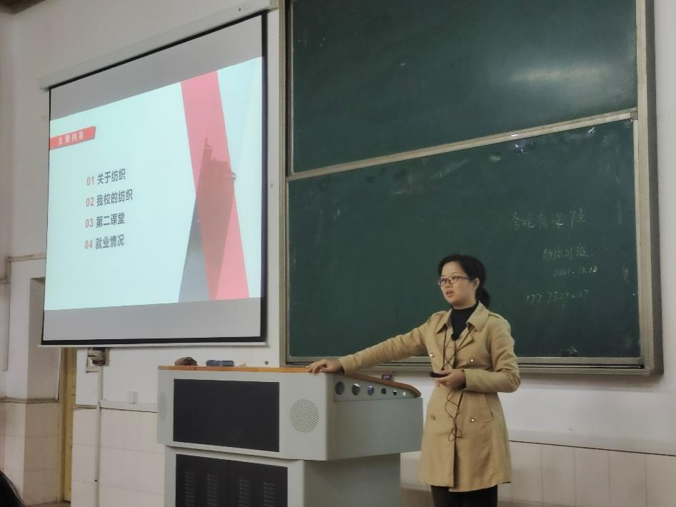 报告在谭老师与同学们的频繁互动中进行着,分外热闹。谭老师从纺织工程专业涉及的领域、国内纺织工程院校情况、公司纺织工程专业的发展历程等方面向同学们展示了“有关纺织”、“有关公司的纺织”。报告图文并茂地介绍了纺织工程教研室优秀的教学、科研人才,展示了往届员工在创新创业训练计划项目中的立项情况及参加国内纺织品设计大赛的获奖情况,给新生们树立了坚定的专业自信。通过引入丰富多彩的“第二堂课”,鼓励新生提前做好规划,丰富老员工活。