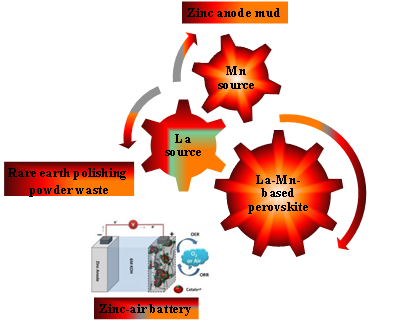 本文围绕可充锌-空气电池中的阴极关键材料,交叉了冶金、材料和纺织领域,分别以抛光粉废料中回收的镧和锌阳极泥中回收的锰为镧源和锰源,选用纺织领域常用的水溶性阳离子聚合物聚乙烯亚胺(PEI)作为聚合剂,利用其优异的聚合能力,螯合溶液中的La3+、Sr2+、Mn2+和Fe3+,制备出双效催化功能的材料(La0.8Sr0.2)0.95Mn0.5Fe0.5O3,应用在可充-锌空气电池中表现出较好的电化学活性和稳定性。